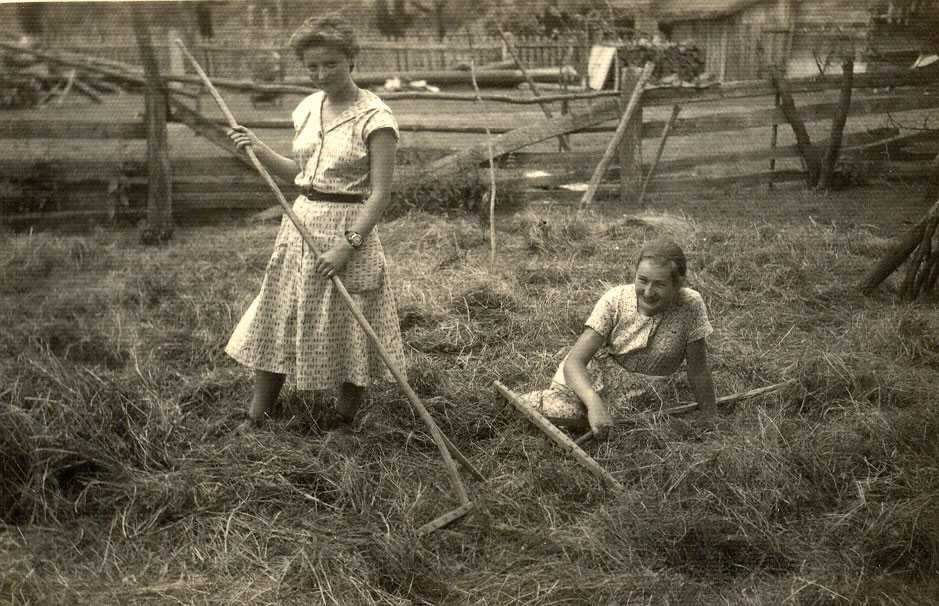 Stanisława Gasek z koleżanką przy suszeniu siana.