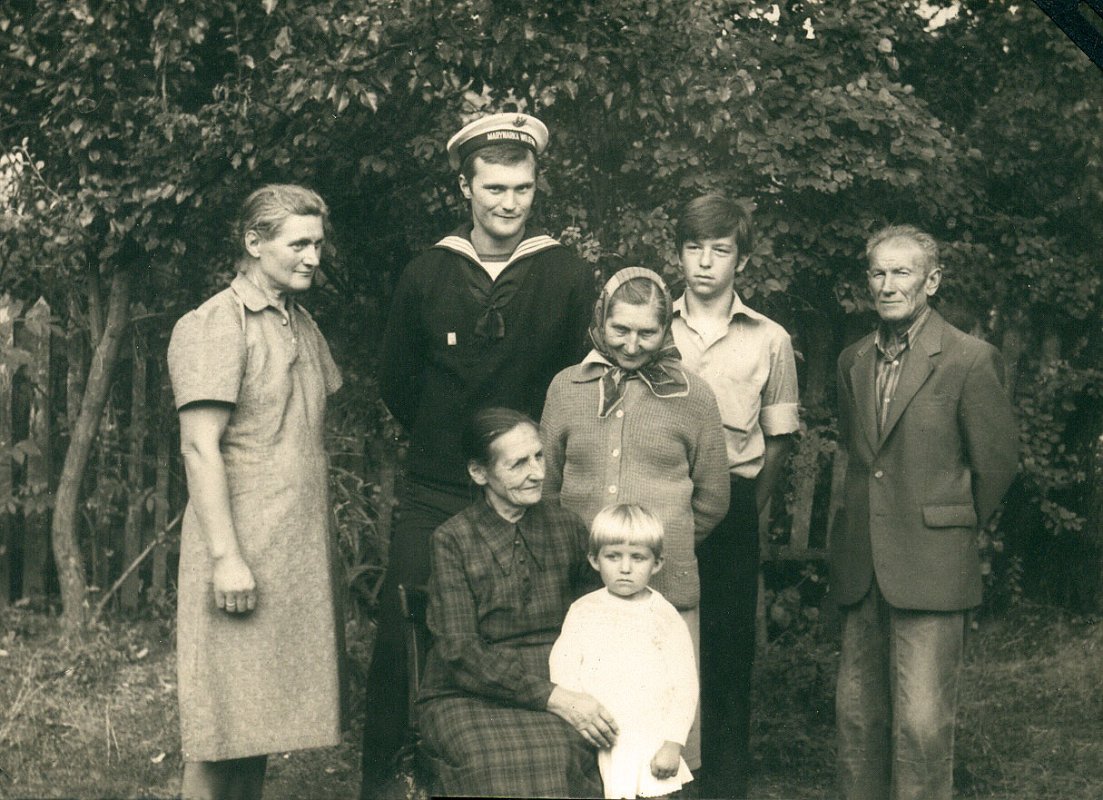 Z lewej: Regina Teresa Baranek (1931) córka Władysława Baran(ka) (1897) i Heleny Reda, z prawej: Józef Rosa (1918) syn Mateusza i Agnieszki Kopacz mąż Reginy Baranek. Siedzi Kazimiera Baranek (1907) żona Aleksandra Gaska, za nią Emilia Nurzyńska (1929) córka Józefa i Aleksandry Baran(ek). | ![]() |